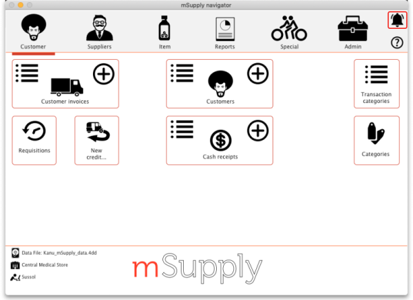 This page will tell you how to set up and use the notifications (alerts) that mSupply can give you.