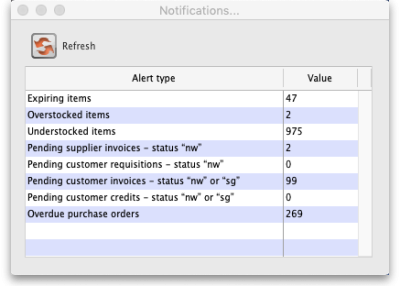 Some of the notifications, like understocked or overstocked items, require some parameters to be set for each store. To set them choose Special > Show stores from the menus, double-click on the store to change the settings for and go to the Preferences tab. The settings you need to make are in the Notifications section.