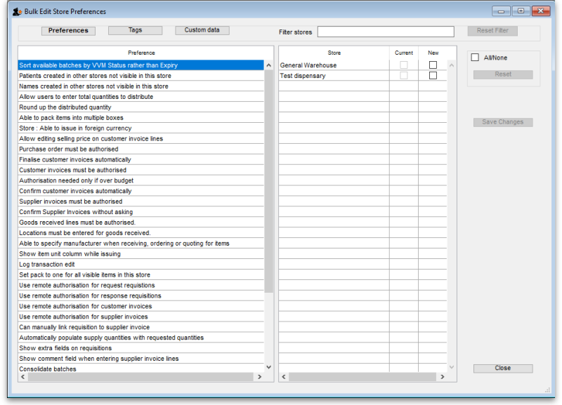 You can apply a setting to all displayed stores with the All/None checkbox on the far-right panel. Once you're done making changes for this preference, click the Save Changes button to write your preference settings to the database. The Current column will be updated with the new settings to reflect the saved changes.