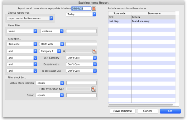 In this mode, nearly all of the report filter windows will display an additional panel to allow you to select which stores' data will be included in the report. Here is an example from the expiring items report: