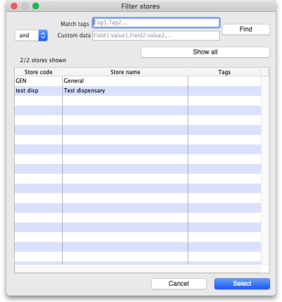 • Match tags: enter the tags that a store must have to be included in the selection. You can enter multiple tags separated by commas; if there are multiple tags then a store which has any one of them will be included in the search (the store does not have to have all of them to be included). Tags are ignored if this field is left empty. See the 25.08 Virtual stores page for details on setting store tags.