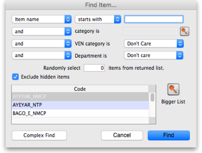 The item search filters will be applied to items visible in the stores selected only. If there are a lot of stores in the datafile you can click on the Bigger List button (or Magnifier button on some windows) to select the required store(s) in a separate window.