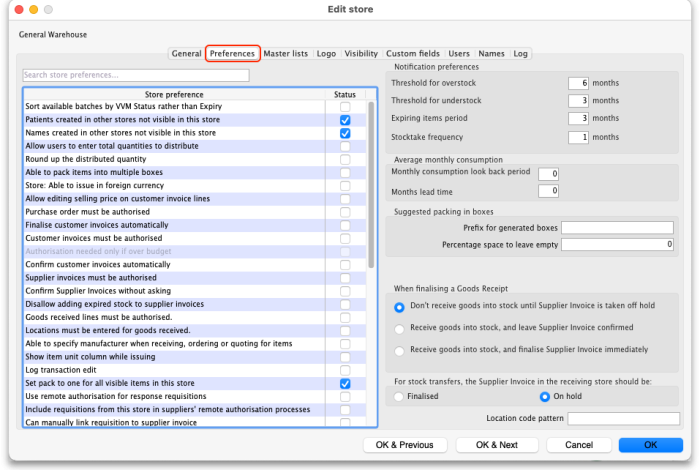 This tab contains the preferences that can be set for a store. Each store has its own settings for these preferences: this is different for the settings in File > Preferences which apply to all stores in an mSupply datafile.