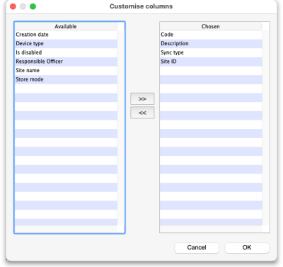 The columns in the Chosen list are displayed in the table, the columns in the Available List can be shosen to be displayed. Select a column you want to show in the Available list and click on the » button to move it to the Chosen list. Similarly, click on one in the Chosen list and click on the « button to move it to the Available list and remove it from the display. You can also drag items in the Chosen list up and down to change the order they appear; top of the left is the leftmost column, bottom of the list is the rightmost column.
