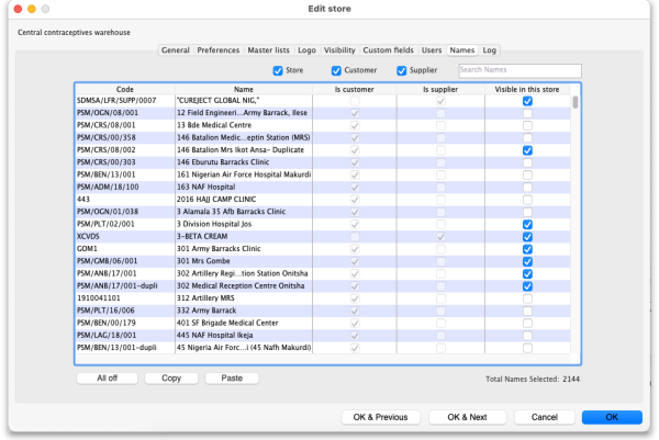 • The Make all names in this store invisible button does the opposite and makes all names in the datafile invisible in this store. Be careful using this - you won't be able to receive or distribute stock from/to anyone until you make some names visible in the store!