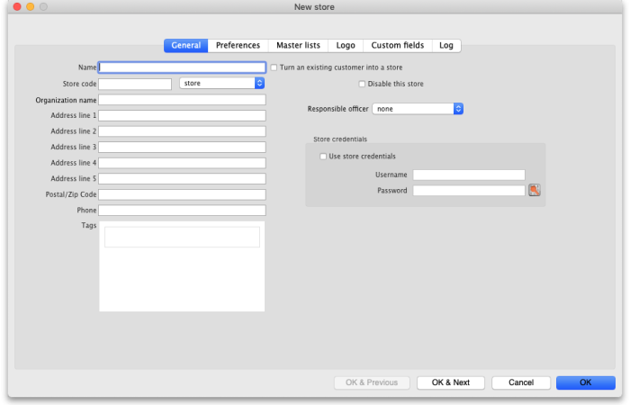 To create a new store click the New store button in the Store list window shown above. This will display the Store details window shown below, which allows you to enter the details of the new store: