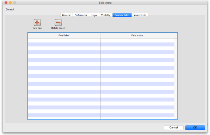 Double-click on any store in the list in the View stores window described above to view or edit its details. You will see the same window as in the Creating new stores section below but the various fields will be filled in with the store's current settings. You can click into the fields and edit them as desired. Note that in the top left of the window, the name of the store you are editing is always displayed, regardless of which tab you are on, so that you always have a reminder of which store you are editing!