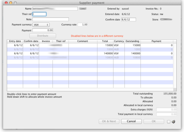 6. Alternatively, you can shift-double-click each non-greyed out invoice to pay the full amount of that invoice. (Note that shift-double-clicking toggles between allocating nothing and full payment against an invoice). A quick way to find out the total outstanding amount for a supplier in the selected currency is to shift double click all the non-greyed out invoices. The total will then be displayed in the Allocated amount.