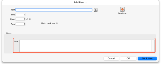 This preference only has an effect if the Show notes in store preference mentioned above is turned on. When it is turned on, additional abbreviation fields are displayed with the Notes field to allow the user to use shortcut abbreviations, like this:
