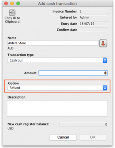 • New Cash Out Transaction: Reasons for a cash out transaction (taking cash out of the cash register).