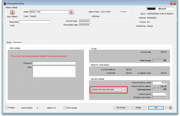 When entering payments on a prescription (see the 11.03. Prescription payments and credits page for details), if there are any active Payment type options then you must select one from the drop down list in the Payment details section on the Payment tab of the prescription before a payment can be saved: