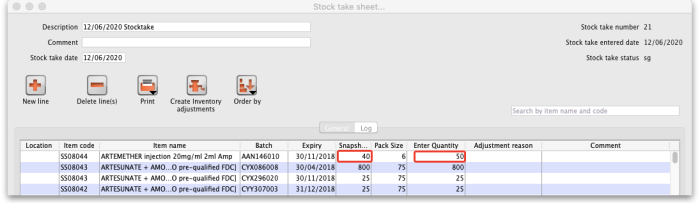 In the main stocktake window, if the Enter Quantity value is adjusted to be different from the Snapshot Quantity value like this, for example: