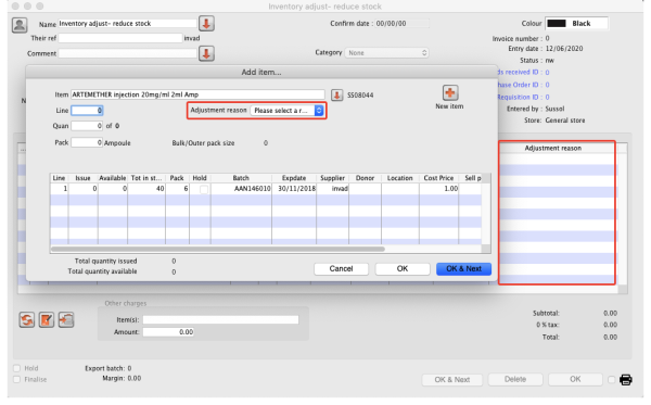 then the edit stocktake line edit window is automatically opened and you must select an option from the Adjustment reason drop down list: