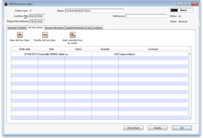 Here you can add an ad hoc item “on-the-fly”. This is useful if you want to process a Purchase Order for a single Ad Hoc item that has not yet been entered into mSupply.