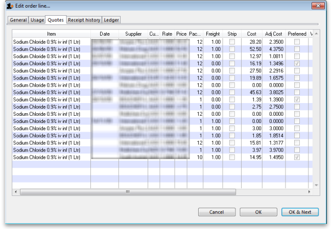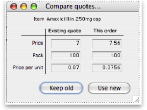 Each order line will be evaluated, and if a quotation does not exist, one will be created. If a quotation does exist and the price you have paid in the order and the price stored for your quotation are different, you will be shown a window to compare prices, and you can decide whether to keep the existing quotation or update it.