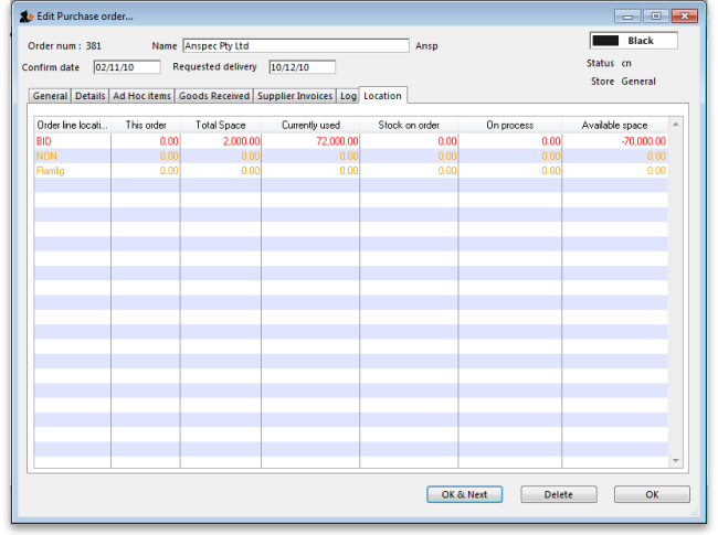 This tab displays the locations of the items received, if this feature is used. Where details of the volume of available space in any location has been entered, and where details of the area/volume of item pack has also been entered, the remaining available space will be displayed.
