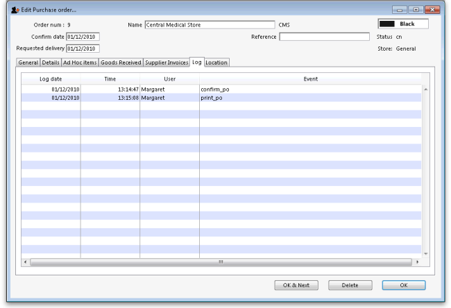 This tab records a log of actions that have been performed on this purchase order. The below image shows that the Purchase Order has been confirmed for sending to the supplier and printed by the user Margaret at the date and times shown: