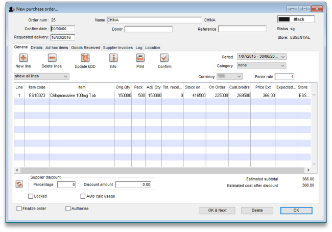 Whichever way you create a purchase order, the purchase order window looks like this: