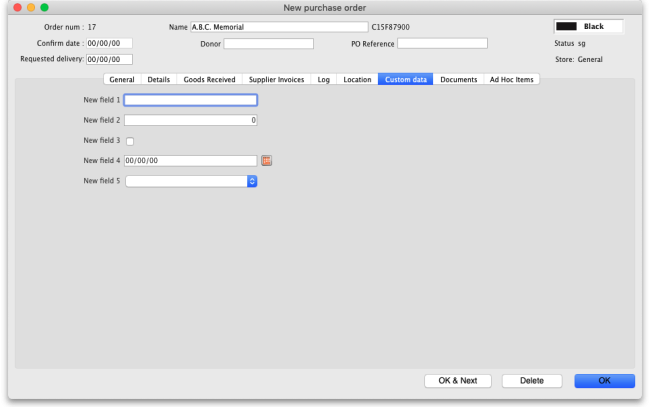 This tab contains all the custom fields created for the purchase order table in the preferences. See the 16.11. Custom fields page for details on how they are set up.