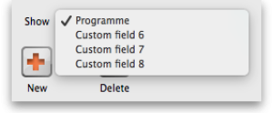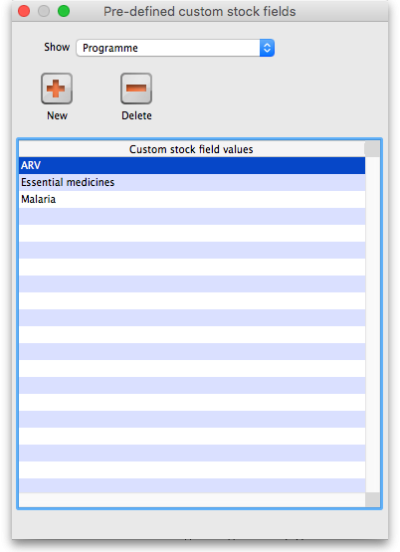 In the Show drop down list, select the custom stock field you want to add/edit/delete values for. Note that the items in the list will be “Custom stock field 5” to “Custom stock field 8” but those fields which have been given a Display name in the preferences will be replaced by it. In our example, Custom stock field 5 has been given the display name “Programme”: