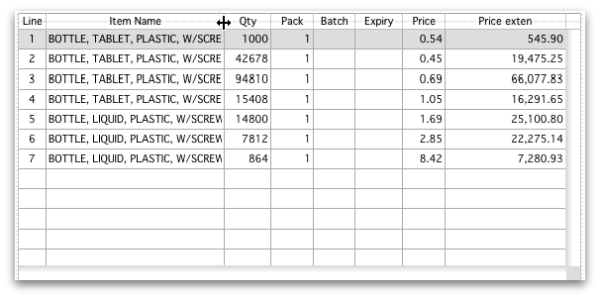 If you have turned on any of the custom stock fields in store preferences they will be displayed as columns (between the Batch and Expiry columns) in the list of invoice lines and the information you entered for these fields will be shown in the appropriate cells.