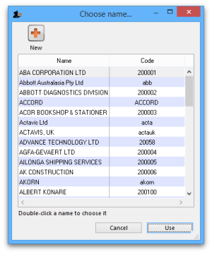 Name: The first thing to do is enter the Supplier's name in the Name field. Type the first few characters of the supplier's name or code, and then press the Tab key. If only one supplier name matches the entry, the supplier's name will be filled in. Otherwise, a list will be displayed: