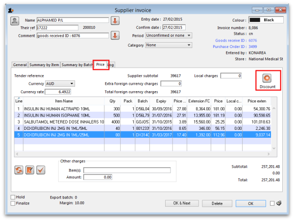 If a supplier gives a discount at the bottom of the invoice rather than adjusting the price of each invoice line, you can use the discount button.