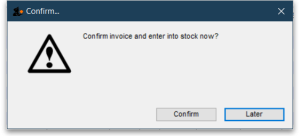 When the OK button is clicked, you will be asked to Confirm invoice and enter into stock now?