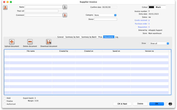 - Upload document button: Click this to upload a document to the invoice. This will open a window enabling you to search for and select the file on your computer. After you've selected it, click on the Open button to upload it. If you upload a file with the same name as one already uploaded, mSupply will upload it as a new version of the already uploaded file.