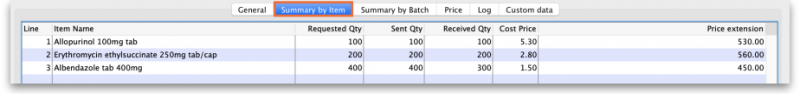 Displays a summary of each item's requested quantity, sent quantity and received quantity. Different batch numbers of the same item are consolidated into a single line.