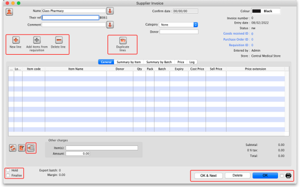 Duplicate lines: Select one or more lines on the invoice and click this button to add duplicates of those lines. Great time saver when receiving large quantities of the same item with similar batches into different shelf locations, for example.