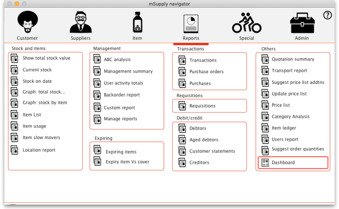 The mSupply dashboard is very helpful for providing visual representations of your data to support analysis and decision making at all levels of the supply chain.