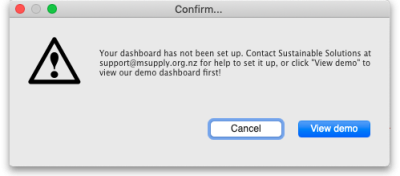 If your dashboard hasn't been setup then you will be shown an alert giving you an option to view the demo mSupply dashboard (which shows you a selection of visualisations and functionality for some dummy data) or to cancel and contact Sustainable Solutions to set your dashboard up for you: