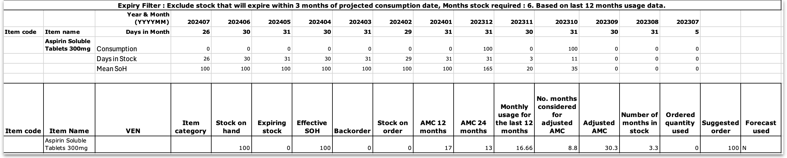 • Effective SOH : Calculated by ('Stock on hand') - ('Expiring stock'). This is the usable stock available.