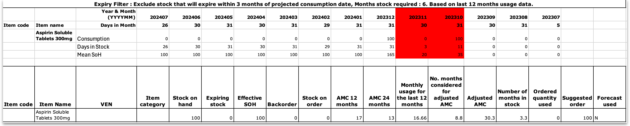 • Number of months in stock : Calculated by ('Effective SOH') / ('Adjusted AMC'). This gives the number of months the current stock will last based on adjusted consumption rates.