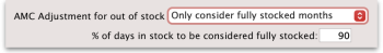• We also ignore months where the mean stock on hand is less than “% of typical AMC that stock level is considered compromised:” value you enter. This is a bit complicated, but here's an example: