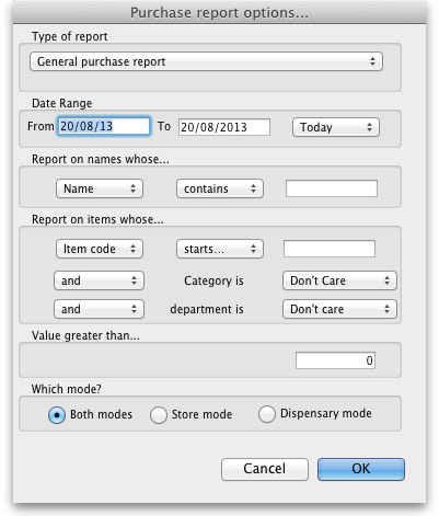 You can also report on items that have a certain category and/or department. By default these options are set to “Don't care”, which means the item categories and departments will be ignored.