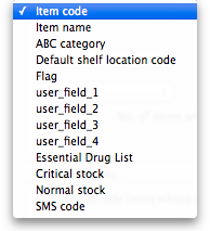 The drop down list, after the item name and code choices, lists several other fields, including any user defined fields, where the names that you have defined for custom item fields in the Preferences are displayed.