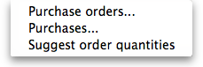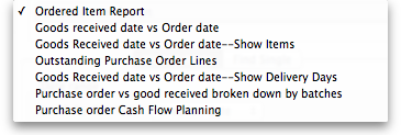 Purchasing reports (focused on what you have ordered and what you have received and what you want to order) are available at Report > Purchasing. The following report types are available: