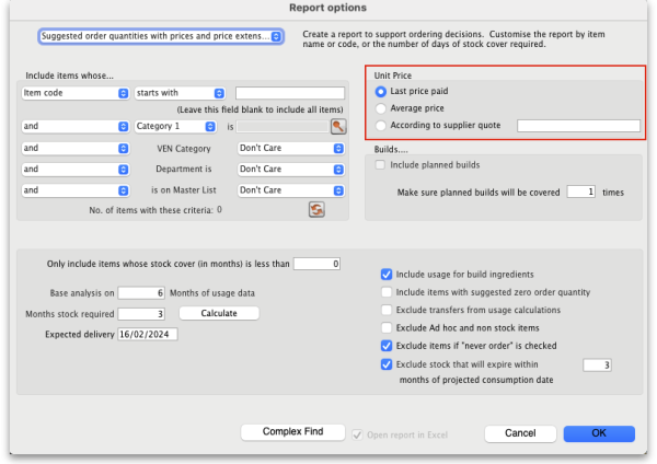 This report is an extension of the previous one, allowing you to see what the suggested order will cost. The filter choices you have are the same as for the suggested order quantities report but you get an additional option to say how your suggested order will be priced: