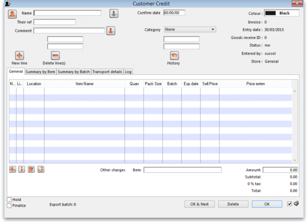 When you have finished entering this line's details, click on the OK button if you're finished or the OK & Next button to add another line. When you've finished adding lines, click on the OK or Cancel button and you'll be taken back top the customer credit window, now showing the lines added.