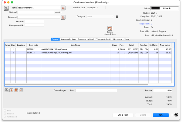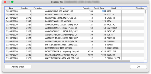 Whichever way you add the lines to the credit, when you have finished doing so, click on the OK button to save the customer credit. This will automatically confirm it and put the items on it into your stock in mSupply.