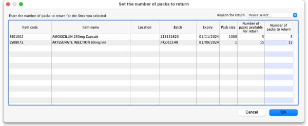 Select the lines you wish to return by clicking on them in the table (the usual Shift and Ctrl/Cmd+click and Ctrl/Cmd+A combinations are available) then click on the button to see the window where you enter the number of packs you wish to return: