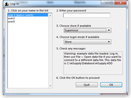 Note that mSupply will “remember” the last data file used, and automatically present the log-in window for that file unless you move or rename your data file. If you do this, mSupply will show you a standard open/save window for you to choose the new name/location of your data.