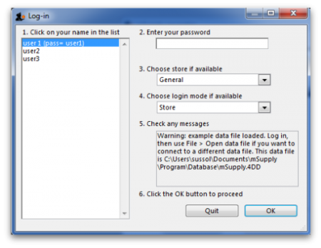 Note that mSupply will “remember” the last data file used, and automatically present the log-in window for that file unless you move or rename your data file. If you do this, mSupply will show you a standard open/save window for you to choose the new name/location of your data.