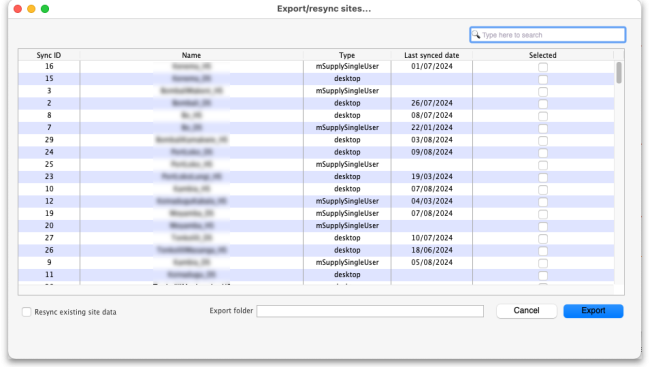 You should use Sync site export when creating a new desktop sync site, including moving a site from mSupply Mobile to mSupply Desktop.