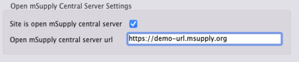 In mSupply v7.14.00 we've added configuration for open mSupply central server, which is required for open mSupply remote site from v2.0.0 Open mSupply Central Server Settings are used to identify a site as open mSupply central server