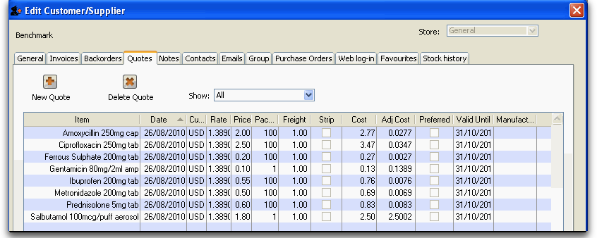 Open the Edit supplier window for the Benchmark supplier and click on the Quotes tab