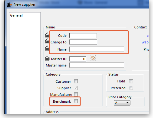 mSupply® requires that the Code, Charge to and Name fields are completed, so you should choose appropriate entries. In the Category section, the checkbox Supplier should already be checked, and you must check the Benchmark checkbox.