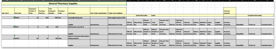 In our example, 5 suppliers have been invited to tender, and 4 have submitted tenders, one supplier having submitted prices for two different pack sizes. One supplier has not submitted a quotation, so all the entries for that supplier are zero.